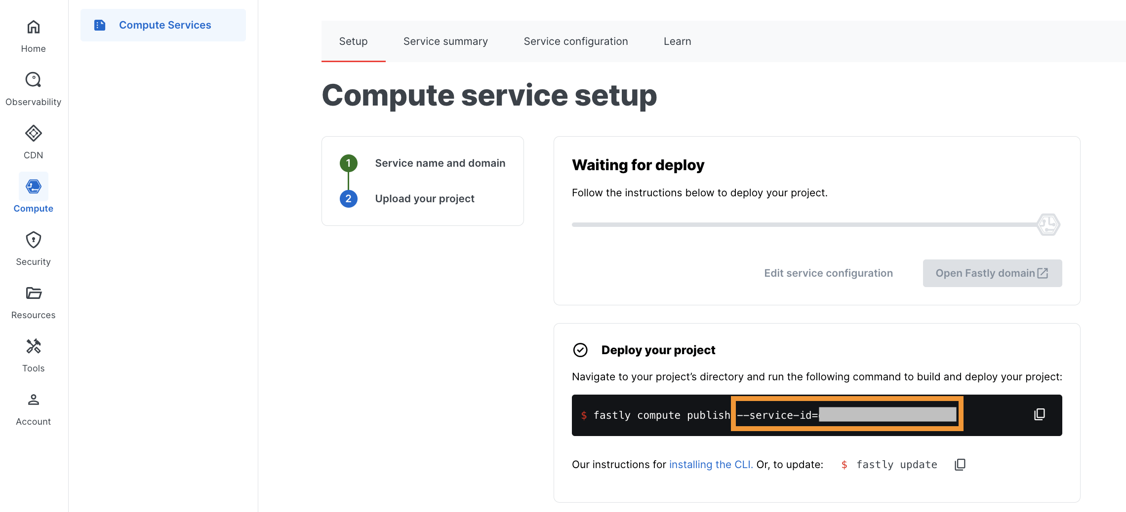 Go to Fastly UI → Compute → Compute services → Create service → Use a local project and create an instance for Wallarm.