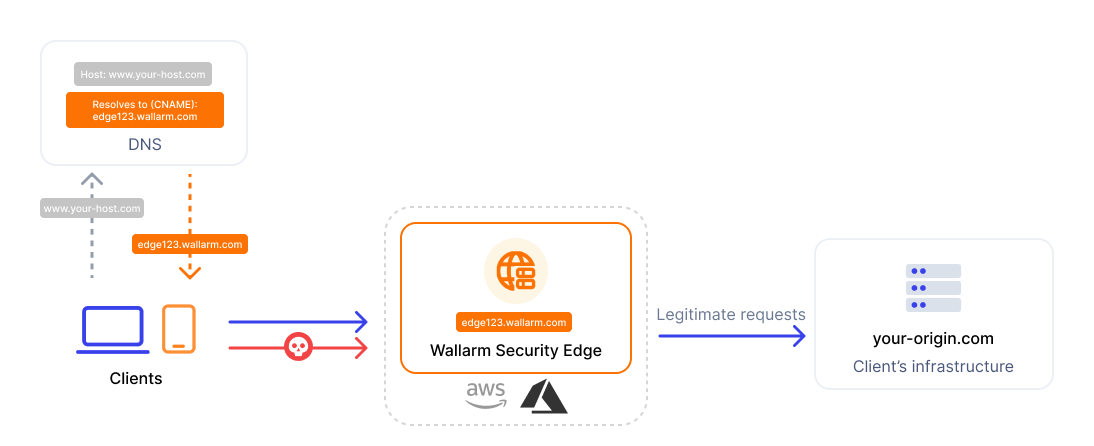 • DNS-based traffic redirection: you configure your DNS to point your API domains to Wallarm Edge Node.