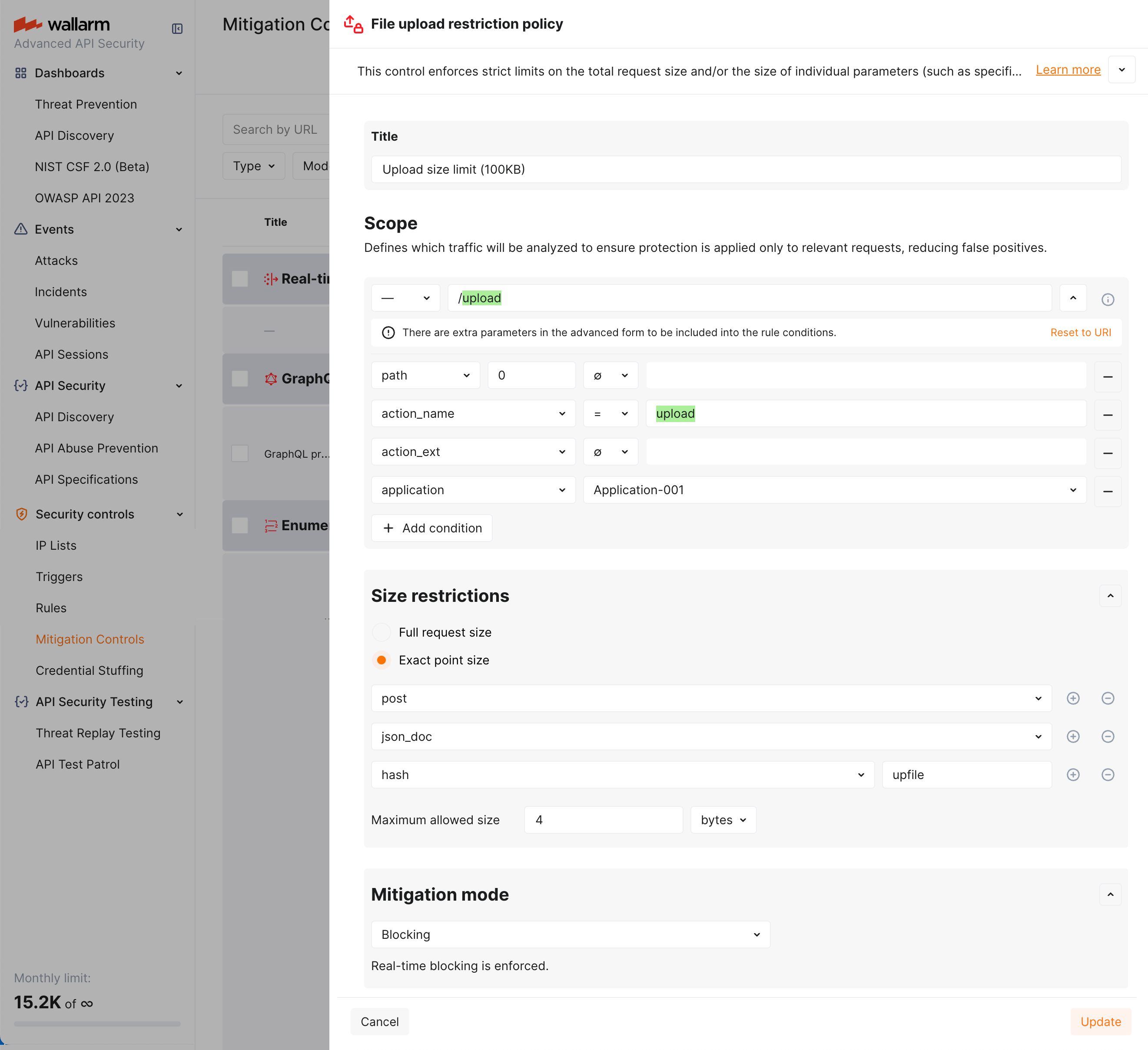 Depending on your subscription plan, upload restrictions are applied via mitigation control or rule. You can set file size restrictions for the full request or its selected point.